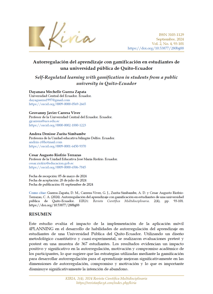 Este estudio evalúa el impacto de la implementación de la aplicación móvil 4PLANNING en el desarrollo de habilidades de autorregulación del aprendizaje en estudiantes de una Universidad Pública del Quito-Ecuador. Utilizando un diseño metodológico cuantitativo y cuasi-experimental, se realizaron evaluaciones pretest y postest en una muestra de 367 estudiantes. Los resultados evidencian un impacto positivo y significativo en la autorregulación, motivación y compromiso académico de los participantes, lo que sugiere que las estrategias utilizadas mediante la gamificación para desarrollar autorregulación para el aprendizaje mejoran significativamente en las dimensiones de autorregulación, compromiso y motivación y lo que es importante disminuye significativamente la intención de abandono.
