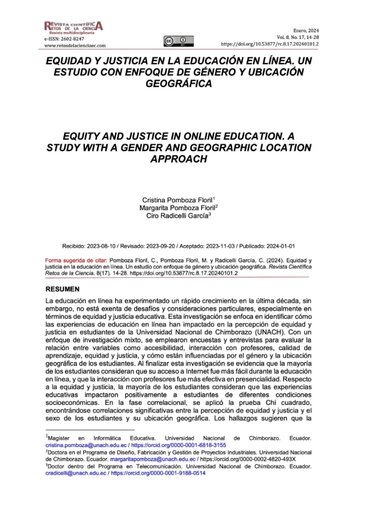 Esta investigación se enfoca en identificar cómo las experiencias de educación en línea han impactado en la percepción de equidad y justicia en estudiantes de la Universidad Nacional de Chimborazo (UNACH). Con un enfoque de investigación mixto, se emplearon encuestas y entrevistas para evaluar la relación entre variables como accesibilidad, interacción con profesores, calidad de aprendizaje, equidad y justicia, y cómo están influenciadas por el género y la ubicación geográfica de los estudiantes.