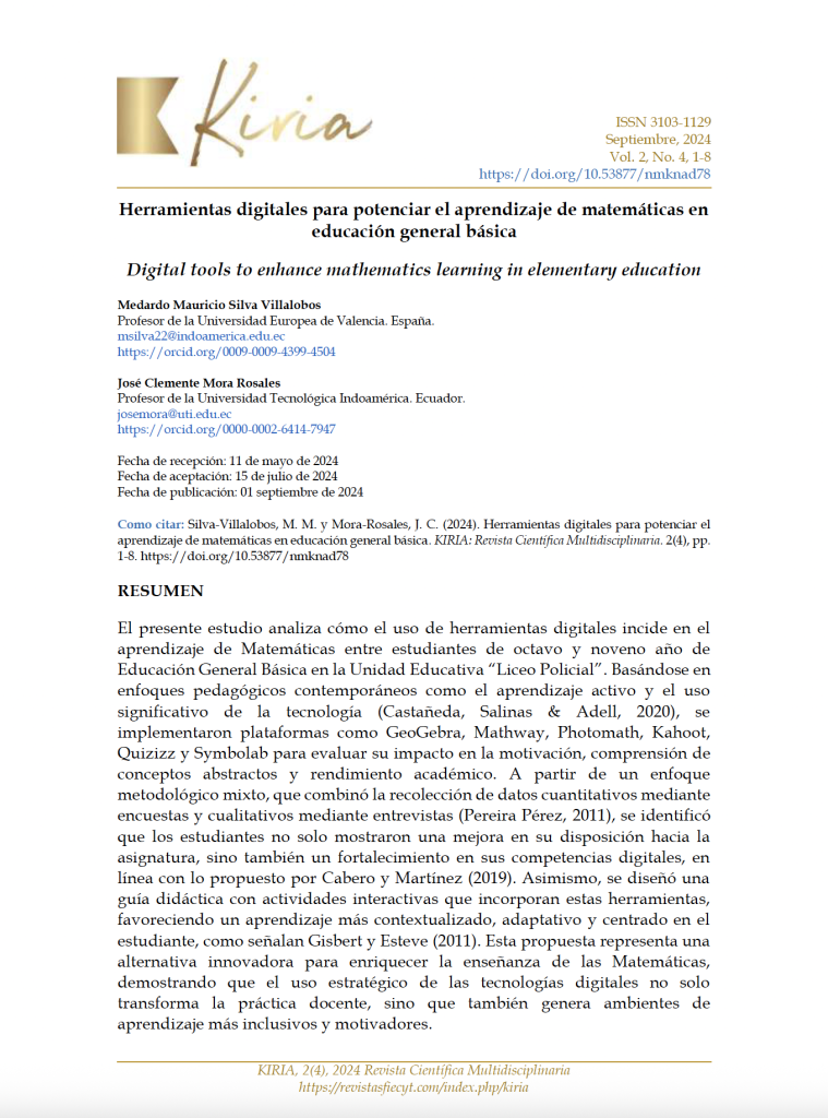 El presente estudio analiza cómo el uso de herramientas digitales incide en el aprendizaje de Matemáticas entre estudiantes de octavo y noveno año de Educación General Básica en la Unidad Educativa “Liceo Policial”. El presente estudio analiza cómo el uso de herramientas digitales incide en el aprendizaje de Matemáticas entre estudiantes de octavo y noveno año de Educación General Básica en la Unidad Educativa “Liceo Policial”. Basándose en enfoques pedagógicos contemporáneos como el aprendizaje activo y el uso significativo de la tecnología (Castañeda, Salinas & Adell, 2020), se implementaron plataformas como GeoGebra, Mathway, Photomath, Kahoot, Quizizz y Symbolab para evaluar su impacto en la motivación, comprensión de conceptos abstractos y rendimiento académico. A partir de un enfoque metodológico mixto, que combinó la recolección de datos cuantitativos mediante encuestas y cualitativos mediante entrevistas (Pereira Pérez, 2011), se identificó que los estudiantes no solo mostraron una mejora en su disposición hacia la asignatura, sino también un fortalecimiento en sus competencias digitales, en línea con lo propuesto por Cabero y Martínez (2019). Asimismo, se diseñó una guía didáctica con actividades interactivas que incorporan estas herramientas, favoreciendo un aprendizaje más contextualizado, adaptativo y centrado en el estudiante, como señalan Gisbert y Esteve (2011). Esta propuesta representa una alternativa innovadora para enriquecer la enseñanza de las Matemáticas, demostrando que el uso estratégico de las tecnologías digitales no solo transforma la práctica docente, sino que también genera ambientes de aprendizaje más inclusivos y motivadores.